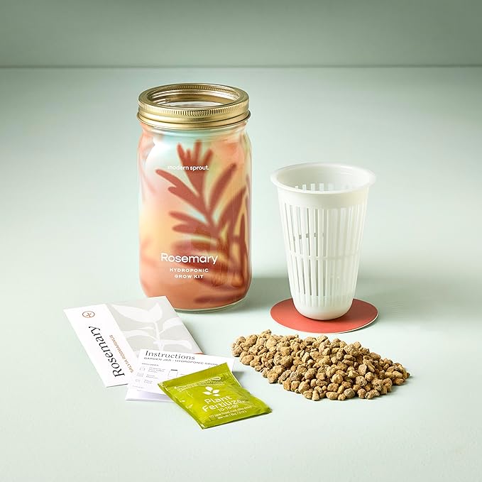 • Package Contents: 1 unit of hydroponic rosemary grow kit featuring a mason jar with a removable sleeve made from recyclable materials (6" high by 3.5" wide, weighing 1 lb), organic non-GMO rosemary seeds, a 100% recycled HDPE net pot made in the USA, lava rock grow medium sourced domestically, plant food, coaster, and detailed instructions; Designed for reuse and proudly assembled in the USA, it offers a sustainable way to grow fresh herbs indoors