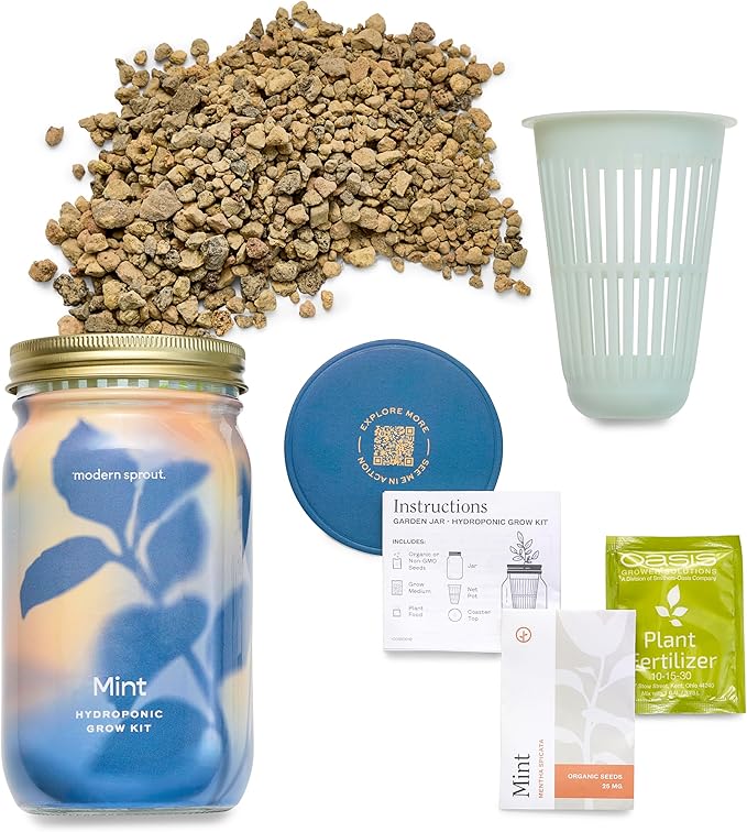 • Package Contents: 1 unit of hydroponic mint grow kit featuring a mason jar with a removable sleeve made from recyclable materials (6" high by 3.5" wide, weighing 1 lb), organic non-GMO mint seeds, a 100% recycled HDPE net pot made in the USA, lava rock grow medium sourced domestically, plant food, coaster, and detailed instructions; Designed for reuse and proudly assembled in the USA, it offers a sustainable way to grow fresh herbs indoors
