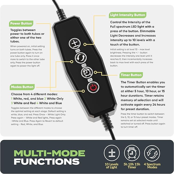 • VERSATILE CONTROL: POWER, INTENSITY, TIMER - The Power button toggles between both tubes or individual tubes. The Dimmer button adjusts Full Spectrum LED light intensity across 10 levels. The Timer button sets durations of 5, 10, or 15 hours, retaining memory for daily activation.