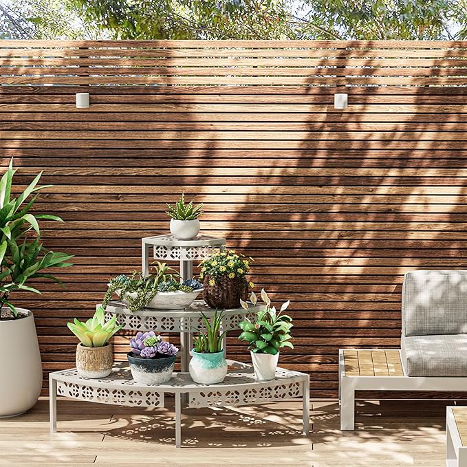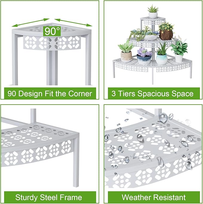 • 【3 Tiers Corner Shelf】This plant rack features 3 tiers to showcase your beautiful flowers, succulent collection, yard decorations, garden tools, and so on. 90° design is saving space and ideal for placing it in the corner.This kind of plant rack can accommodate 6 to 8 medium-sized potted plants in total, and the bottom layer can hold 3 to 4 medium-sized potted plants.The load-bearing capacity of each floor is approximately 50 pounds.