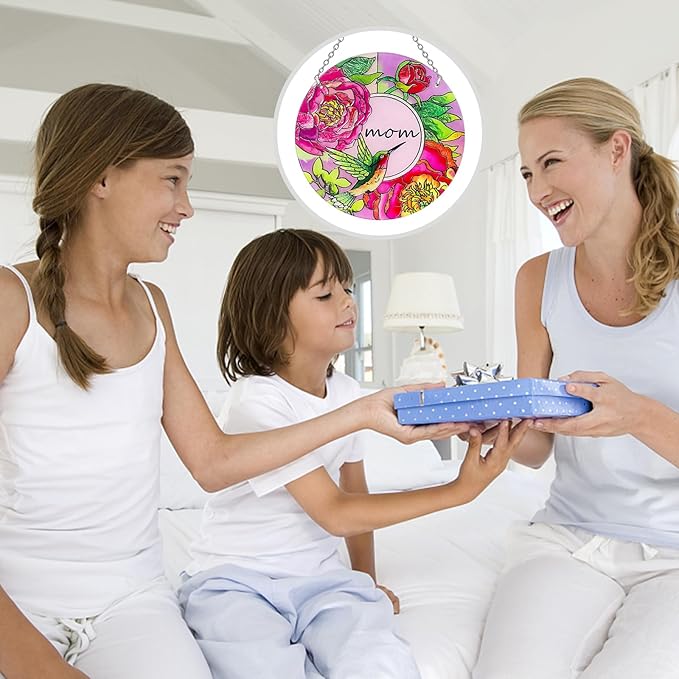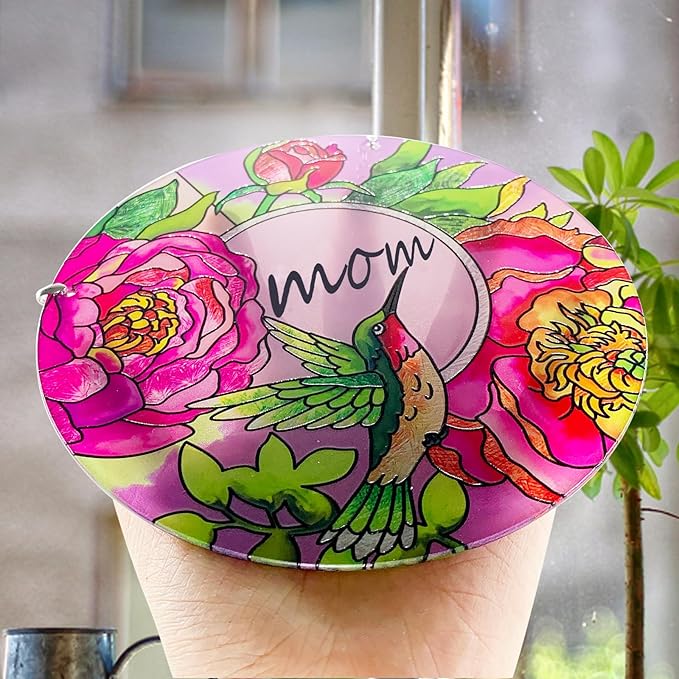Hummingbird Gifts for Mom, Stained Glass Bird Window Hangings, Sun Catcher Ornament Hanging for Windows, Hummingbird Suncatcher for Women, Mother's Day Birthday Christmas (Suction Cup, 6in)