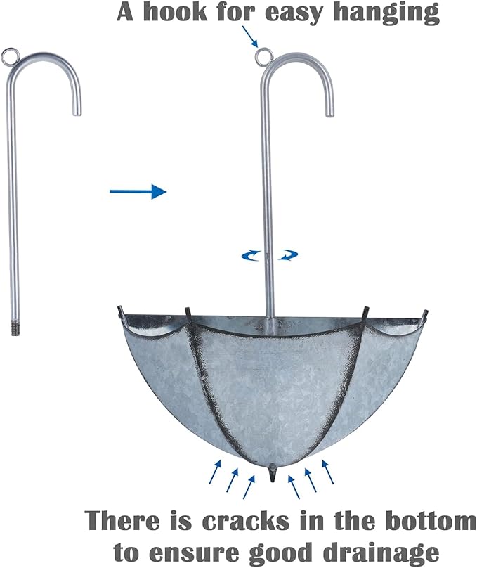 • UNIQUE UMBRELLA DESIGN: Creative shape of inverted umbrella design with long handle, perfect for garden fences, backyard trees, or courtyard railings. There is a hanging hole on the handle and the back of the umbrella is flat, which makes it suitable for mounting on a wall or any flat place. There is some weld cracks in the bottom to ensure good drainage
