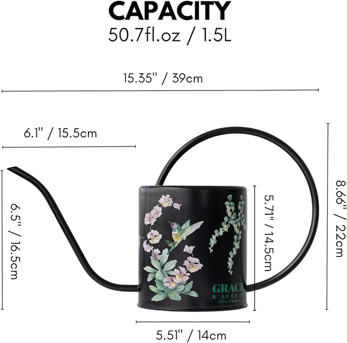 Watering Can for Indoor House Plants - Cute Decorative Metal Gardening Small Water Can for Houseplants & Flowers with Long Spout - 1.5L 51floz 0.4 Gallon (Hummingbird Black)