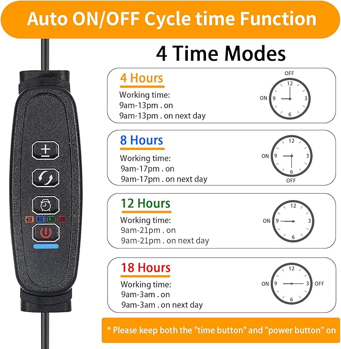 • 【Auto On/Off Timing Function】The plant grow light comes with a cycle memory timer function, which can Auto turn on/off every day according to your settings: 4/8/12/16 hours, the grow light will Auto turn on and off at the same time the next day, no manual operation is required, you can take care of your plants when you on work or vacation.