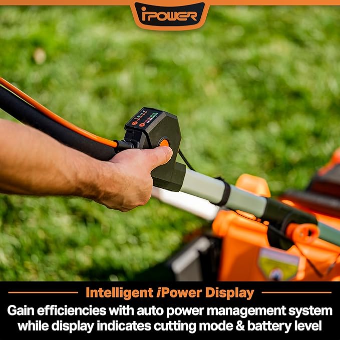 • iPOWER TECHNOLOGY DISPLAY: Save energy and gain efficiencies while mowing your lawn with this intelligent and automatic power management system. Display indicates the cutting mode and battery level.