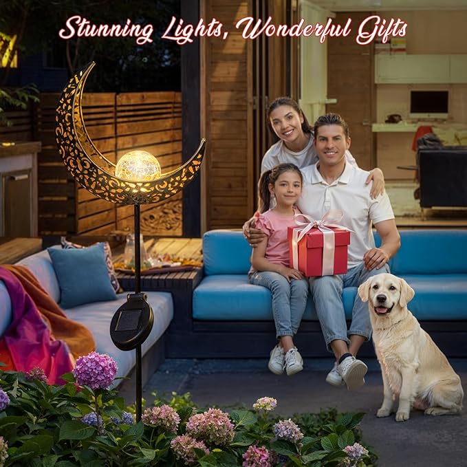 • The crescent moon solar garden stakes design with Warm White 8 Lumens LED, emit stunning glow. The reflection of the pattern is beautiful enough to create a romantic and festive atmosphere in your front porch, back yard,lawn,flower bed or garden.