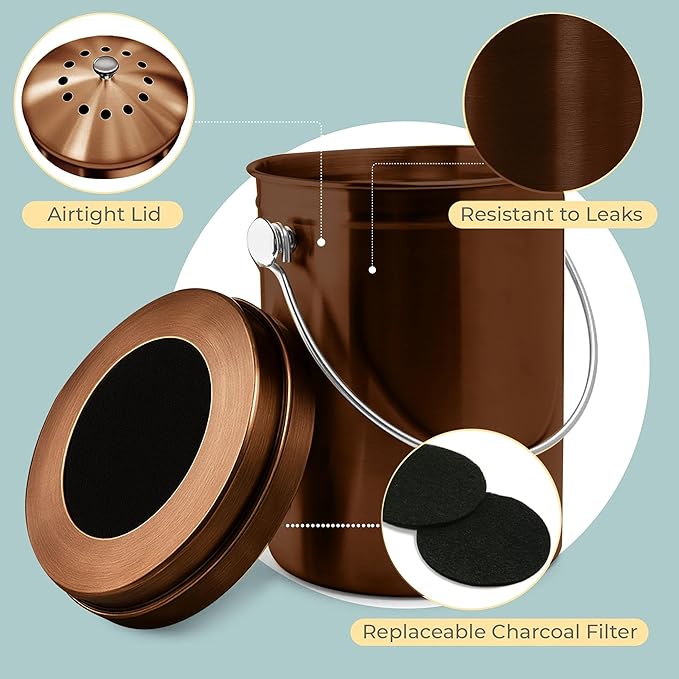 • EASY TO CLEAN & RESISTANT TO LEAKS: Our one-piece molded counter compost bin with lid, resists rust and leaks, making it easy to clean and maintain. Say goodbye to welded bins that deteriorate over time.