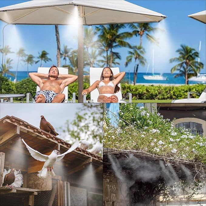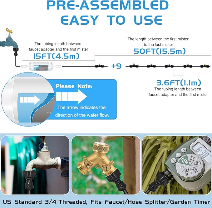 • EASY TO INSTALL - This misting system is completely pre-assembled, our US standard 3/4" adapter widely adapted to garden connectors, outdoor faucets, hose diverter, etc. Just connect it to the faucet and it works. Accessories and user manuals available, your misting ideas can be realized in just a few minutes.