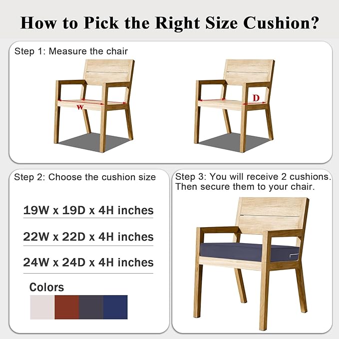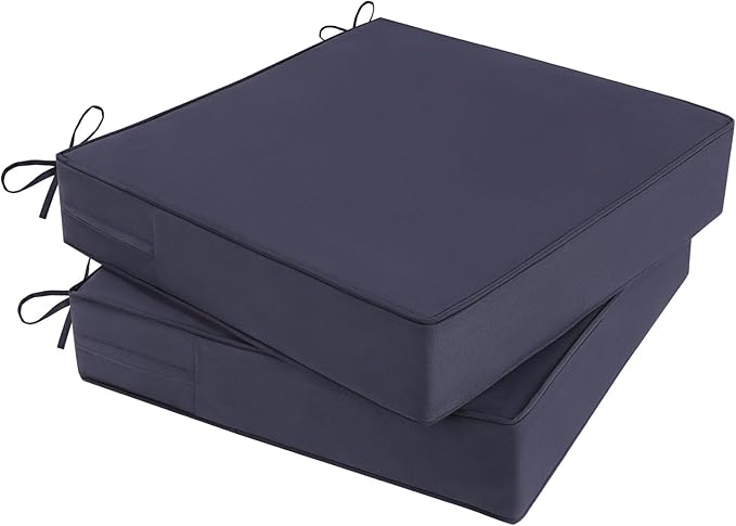 • PERFECT SIZE: Outdoor chair cushion set includes 2 cushions. Cushions measure: 19 inch (W) 19 inch (D) 4 inch (H). Fits most standard size outdoor chairs. Since the outdoor cushions are vacuum-packed, it may take 24-51 hours for the cushion foam to fluff back up after opening the vacuum bag