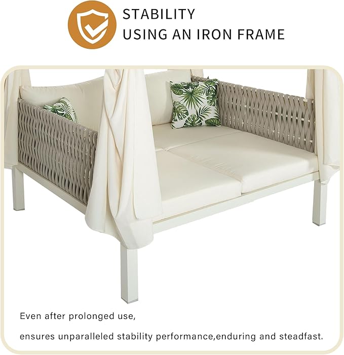 Polibi Outdoor Patio Sunbed with Beige Curtains,Outdoor Sun Lounger Bed with Pillows,Rubber Core Rope Weaving Outdoor Double Chaise Lounge Suitable for Pool,Garden,Beige
