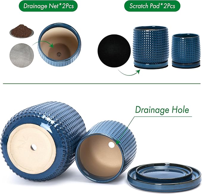 • Drainage Hole & Matching Saucer: Each pot comes with pre-drilled drainage hole and perfectly matching ceramic design tray for small amount of excessive water drain.
