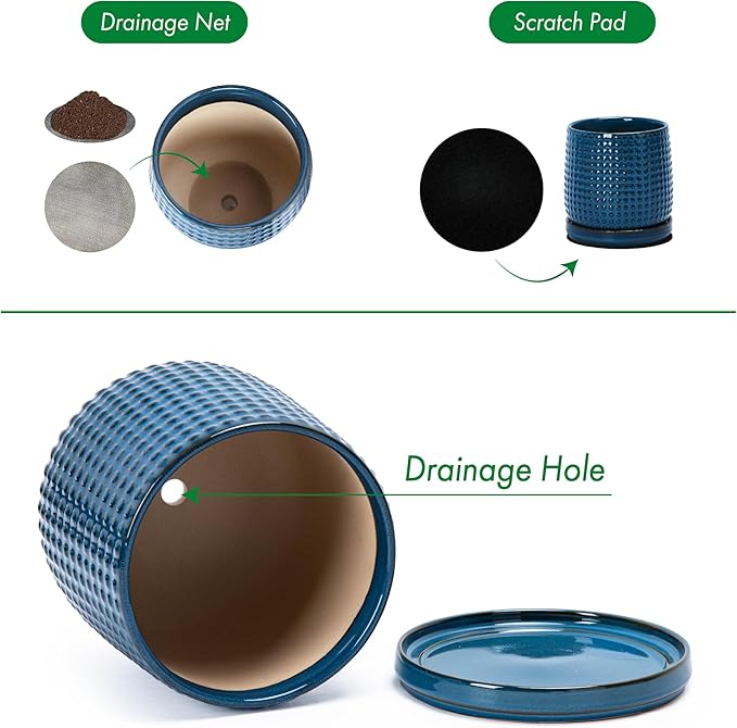 • >> Drainage Net and Pad - A stainless-steel drainage mesh net is also included to prevent soil from falling off the pot. Another protective pad is included to protect tabletop wood surface from scratches.