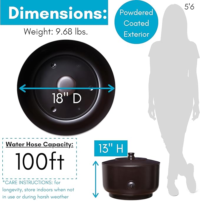 • LARGE CAPACITY STORAGE: The BIRDROCK HOME Water Hose Holder Pot provides ample space, holding up to 100ft of garden hose. This heavy-duty metal container is perfect for organizing and keeping your lawn and patio tidy, while the charcoal finish adds a touch of elegance to your outdoor space.