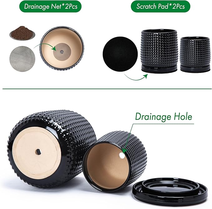 • Drainage Hole & Matching Saucer: Each pot comes with pre-drilled drainage hole and perfectly matching ceramic design tray for small amount of excessive water drain.