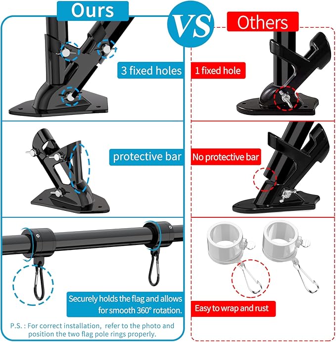 • 🇺🇲Upgraded Bracket and Tangle Free Rings: The high strength aluminum alloy flag pole holder has unique protective bar and 3 fixed holes to make the two-position (90° and 45°) flag pole more stable. The two new designed flag rings and two sturdy carabiners, which could make the flag tangle-free in the wind. And Adjustable length swivel flag pole kit can be installed according to the different size flags.