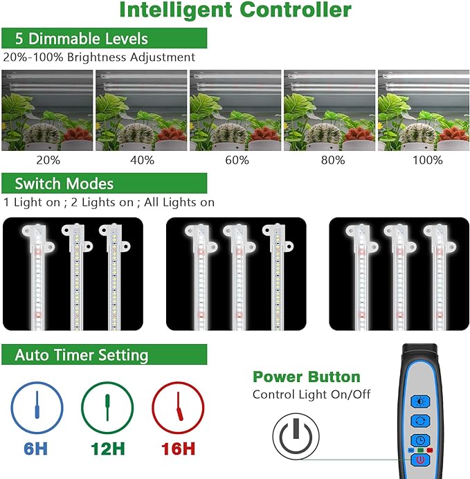 • 3 switching functions and 5 brightness: Press button for 5 Dimmable , no need to worry about burning plants. It also have 3 switching functions of the light bar, “A light on, B light on, All light on”. Suitable for both home, office.
