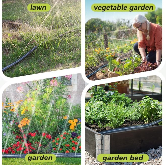 • Versatile Watering Solution: Designed for flexibility and versatility, this sprinkler hose is your go-to tool for watering new sod, gardens, shrubs, or any tight plant space, providing adaptable and efficient watering. With just one sprinkler hose, meet all your watering needs effortlessly.