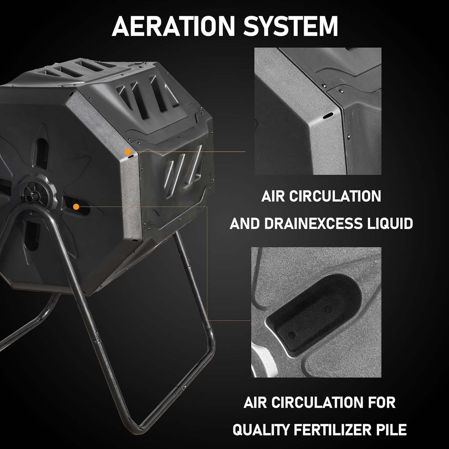 • Dual-Bin Design: The double bin design presents a unique take on the continuous-use composting concept. Two individual chambers permit one side to complete composting while the other remains available for fresh waste addition. Regular rotation of the two sides generates a continuous flow of nutrient-rich compost.