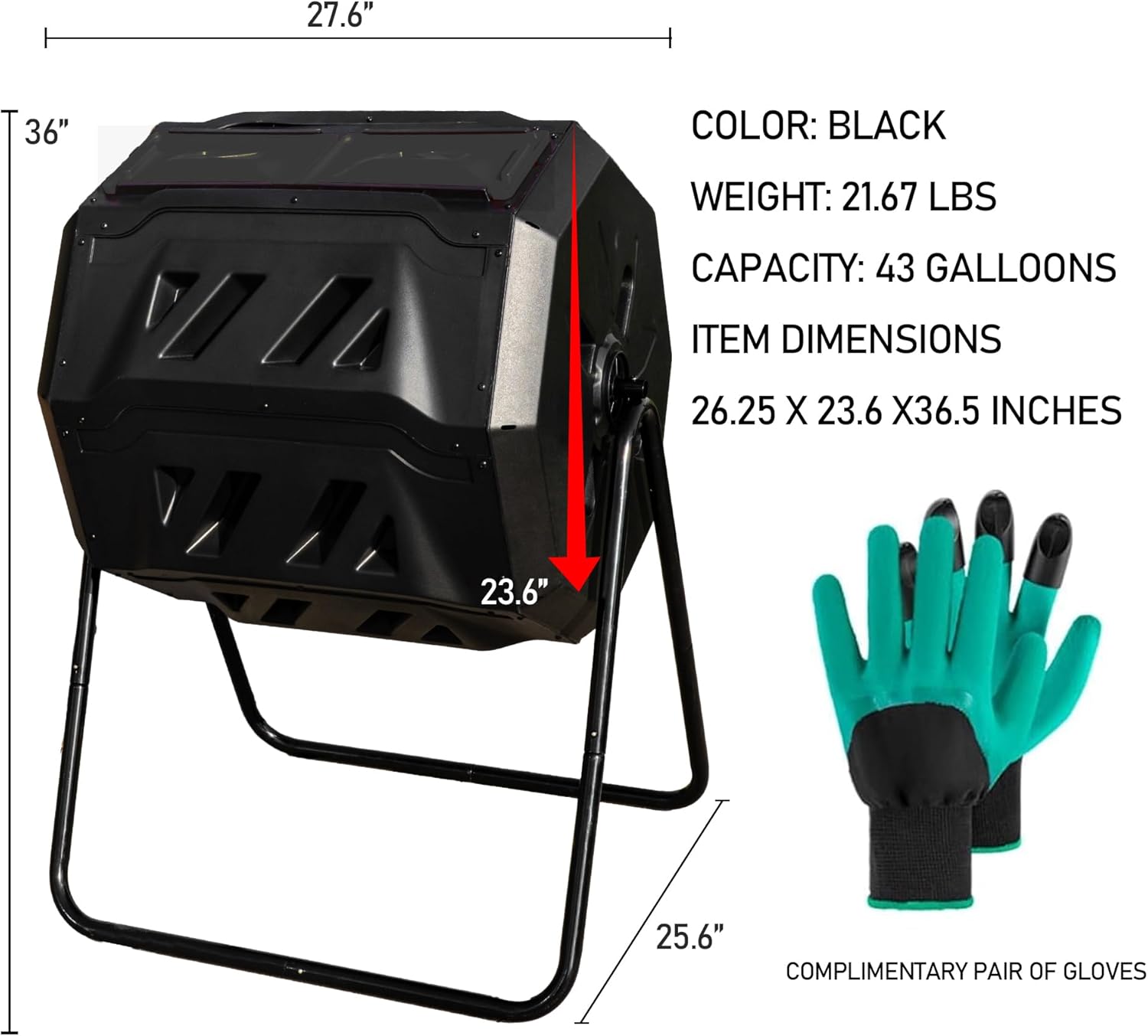 • 43 Gal Dual Chamber Composter: This 43 gallons composter with dimensions of 27.6 × 25.8 × 36 inch. This large tumbling composter makes recycling kitchen scraps a breeze.