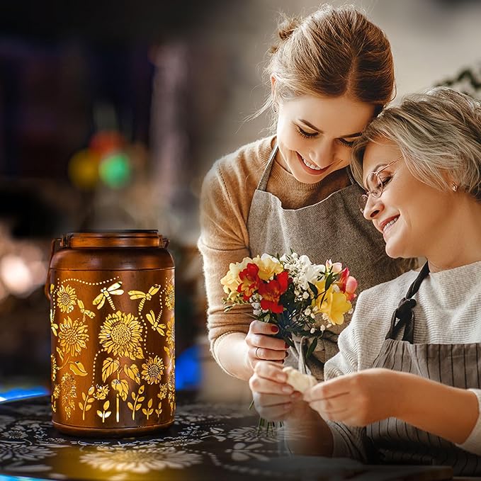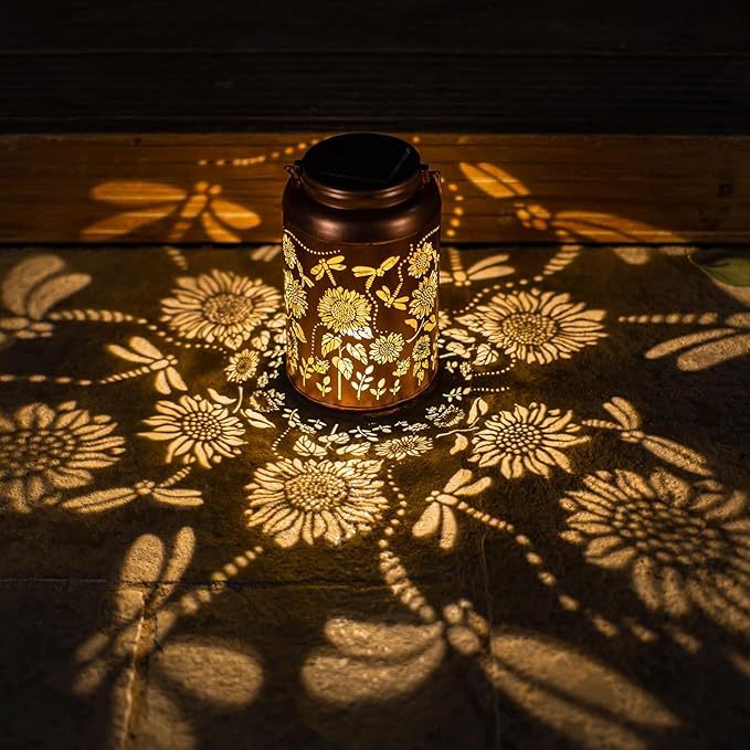 • 【Unique Sunflower Pattern】The hanging solar dragonfly light adopts retro hollow design with warm light with sunflower pattern,casting beautiful patterns on the wall or lawn,Bring life and fun to your garden,a creative gift for family,mom,women and friends during holidays.SIZE:7.20"H x 4.4"W x 4.4"L