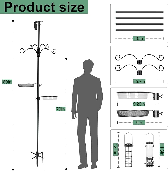 • STURDY DESIGN: Our pole kit provides solid prongs base to support bird feeders, house. The metal powder-coated so it will not rust easily. The diameter of pole is 0.9 inch. The pole height is 80 inch (6 feet tall). The bird house is not included in the package