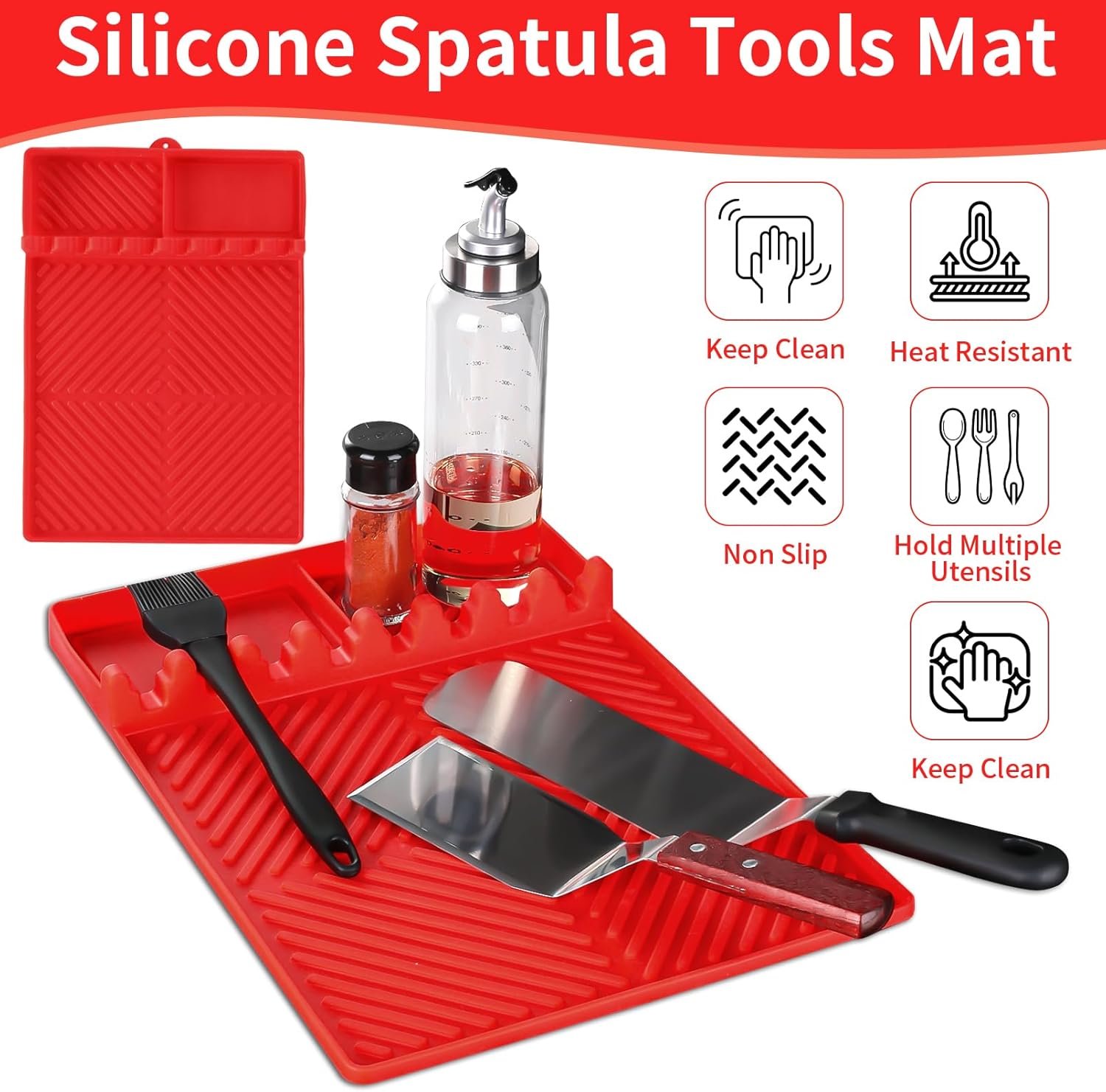 • 【Your Kitchen's Best Friend】- Say goodbye to countertop chaos with this silicone spatula mat. Its easy-to-clean, heat-resistant, and versatile design makes it the perfect companion for every kitchen enthusiast. Unleash the full potential of your Blackstone side shelf with this essential addition.