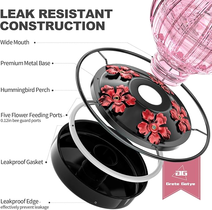 • LEAKPROOF FUNCTION - Build-in durable gasket, unique design makes base connection proper and seamless, even when the hummingbird feeders for outdoors hanging is shaken by wind or birds perching on it. After filling the container and screwing it onto the base, flip it over and hang it on a tree/deck hook/shepherd's hook/hangers/window hook.