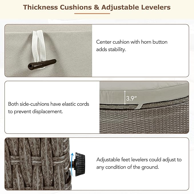 • 💗 Thickness Cushions: The backs of the cushions on both sides are attached to the rattan frame with elastic cords to prevent displacement during use. Horn buttons are incorporated into the cushions at the center section for added stability, ensuring that the cushions stay firmly in place. Adjustable feet levelers could adjust to any condition of the ground.