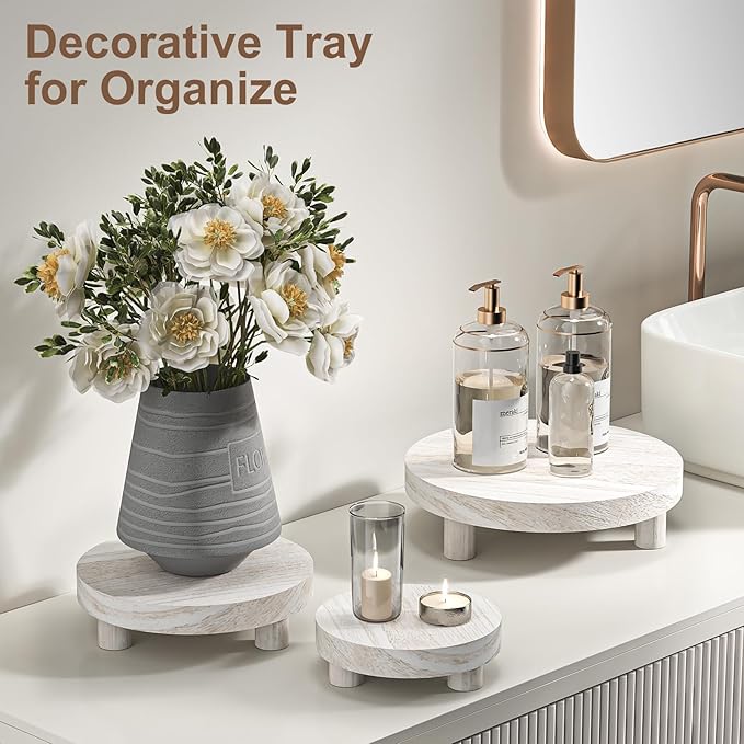 • What You Receive: You will receive three different diameters (6", 8", 10") of round trays and 3 different heights (0.98"", 1.38"", 1.77"")of the feet, which provide endless DIY possibilities. This wooden plant stand can be stacked, stand alone or remove feet for an easy tray display. Easy assembly, just screw into the pre-drilled holes then a beautiful display stand is assembled.