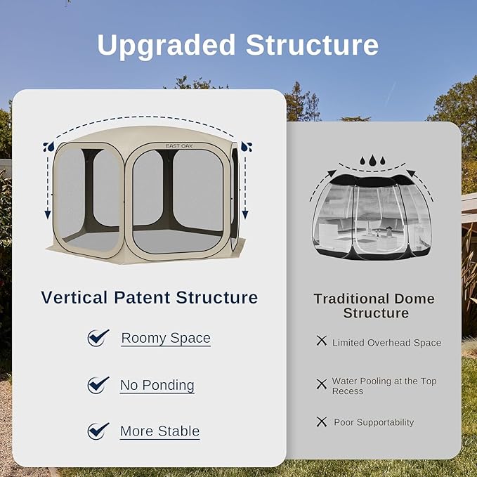 • ๐—ฅ๐—ผ๐—ผ๐—บ๐˜† ๐—ฆ๐—ฝ๐—ฎ๐—ฐ๐—ฒ and ๐—จ๐—ฝ๐—ด๐—ฟ๐—ฎ๐—ฑ๐—ฒ๐—ฑ ๐——๐—ฒ๐˜€๐—ถ๐—ด๐—ป: The top structure is supported by heavy-duty fiberglass, which prevents water from accumulating and delivers more space. The zipper can be used on both sides, and its connection with the tent is upgraded with doulble stitching, making it less likely to tear. The door curtain can befixed to the side for easy access