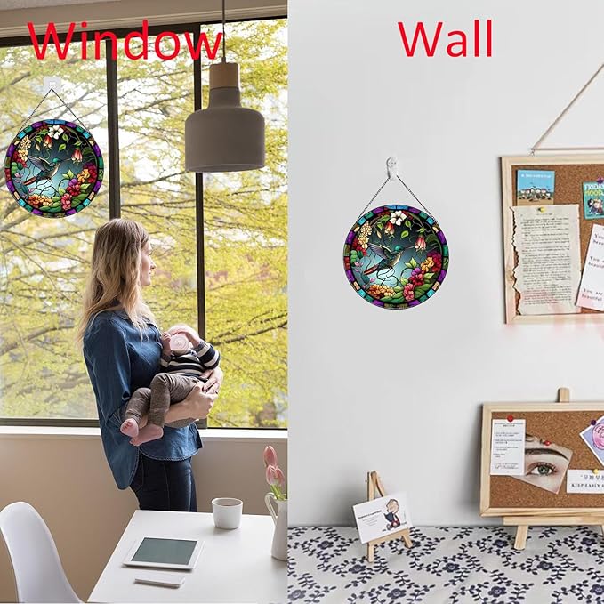 • 【Easy to Use】This stained glass window hanging painted a hummingbirds and flowers, vivid and full of vitality. Ideal for those who love pastoral and nature, and seek a return to original nature! You can hang it in the position you want to decorate,it's a great home decor.