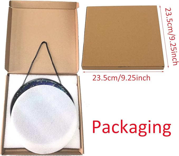 • 【Product Size】Stained glass hanging size is 20*20cm/7.87*7.87inch,equipped a chain,the size is 34cm/13.4inch. You can hang it anywhere you want, balcony, window or courtyard. Stained glass decor capture sunlight and add vitality and color to your home.