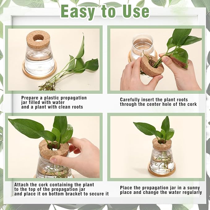 • Reliable Materials: plants propagation vases are made of plastic, not easy to break or be fragile; Cork toppers are made of wood, preventing excessive water evaporation, independent bamboo saucers are made of bamboo, suitable for home, adding a touch of natural charm to settings
