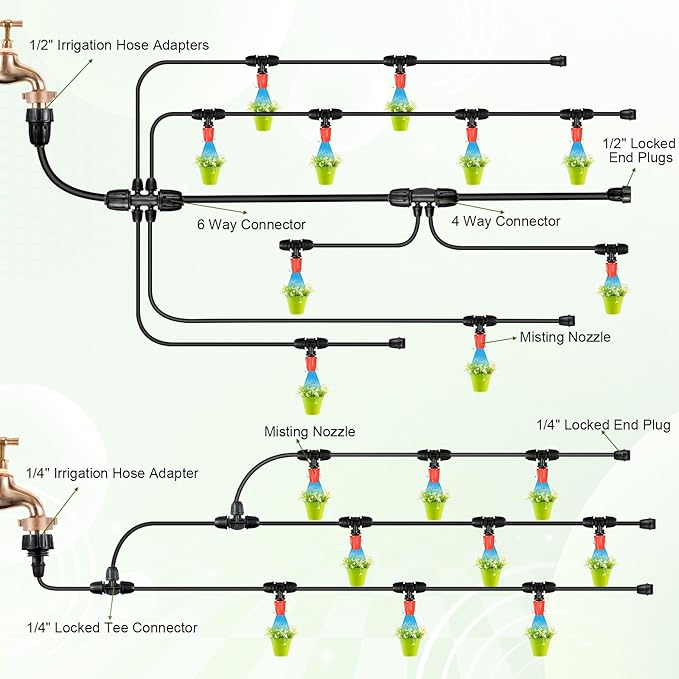 • Complete Irrigation Set: this drip irrigation fittings kit includes 2 pcs 6 way connectors, 2 pcs 4 way connectors, 10 pcs 1/4" locked tee connectors, 10 pcs misting nozzles, 2 pcs 1/4" irrigation hose adapters, 2 pcs 1/4" locked end plugs, 4 pcs 1/2" irrigation hose adapters, and 4 pcs 1/2" locked end plugs; It provides all the necessary components to meet your irrigation needs and create a customized drip irrigation system, a great starter kit for your garden