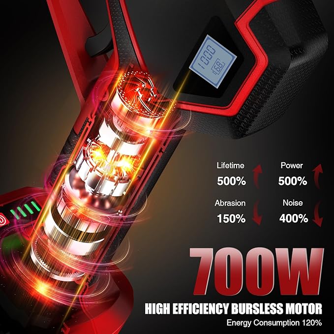 • UPGRADED 700W BRUSHLESS MOTOR: The battery pruner is equipped with a more powerful 700W brushless motor, which has more power and speed, higher load capacity, acceleration and stability, as well as longer service life compared with the low-power copper motors in the market