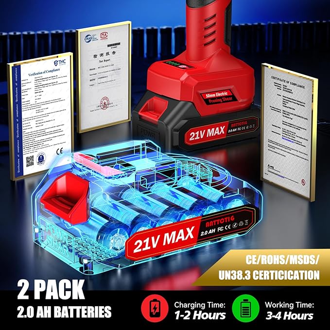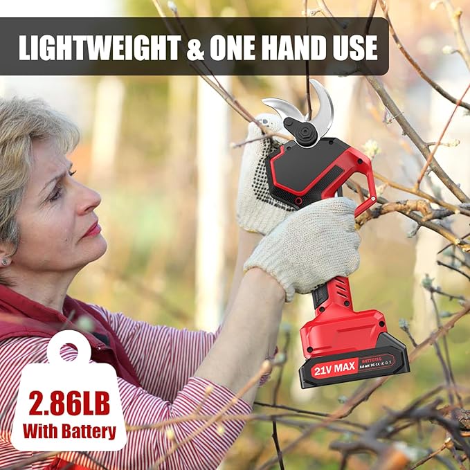 • 2PACK 2000MAH BATTERIES: Equipped with two 21V 2000mAh rechargeable batteries, this gardening pruning shear provides users with long-lasting power support, allowing it to work continuously for long periods of time without the need for frequent recharging, thus improving work efficiency and convenience.