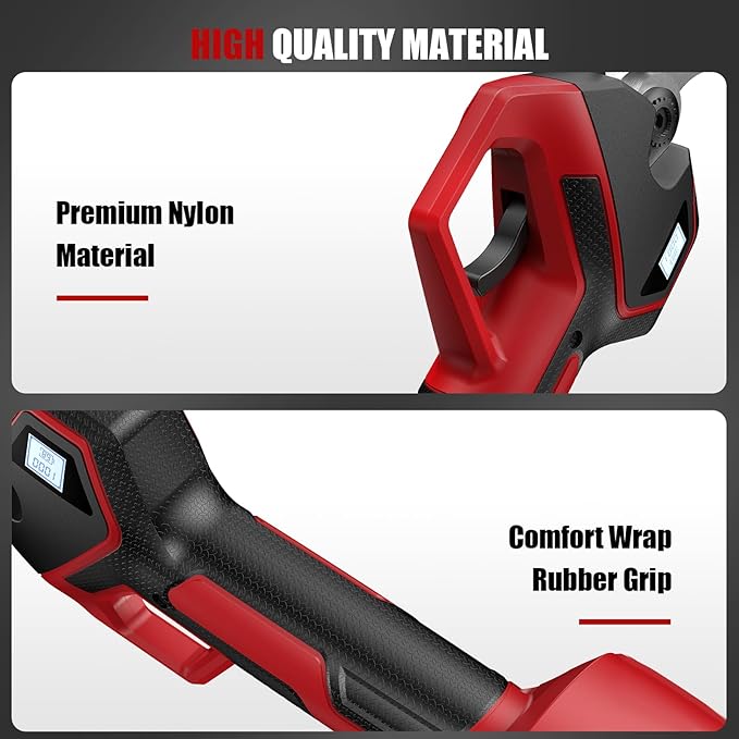 • UPGRADED APPEARANCE DESIGN: The appearance of the battery operated pruners has been upgraded with a premium version of red nylon shell with black overmolded design. This combination not only enhances the texture and premium feeling of the product. In addition, the black rubberized design also enhances the comfort of use.