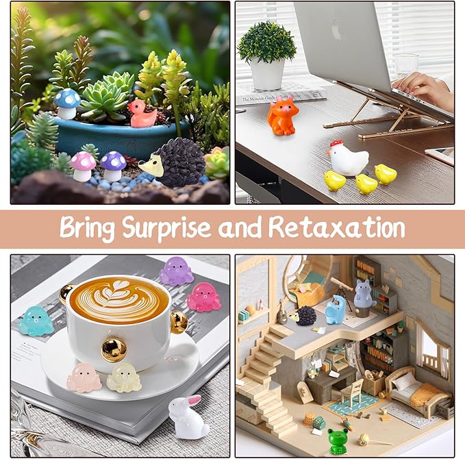 • 🐇【Adorable&Diverse Design】: The style includes 150 pieces of various shapes such as yellow duck, mushrooms, ladybugs, hedgehog family, rabbits, frogs, octopuses, starfish, etc. They are diverse in color and you can DIY the miniature landscape you want.