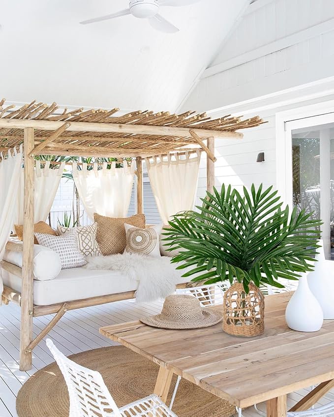 • [Realistic Tropical Leaves] -Faux palm leaves are made from soft, real touch plastic and flexible fabric to mimic the natural touch feel and shape of real leaves, this realistic fake plants décor is non-toxic and durable.