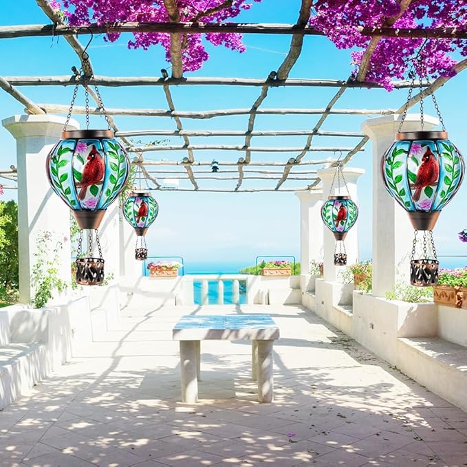 • 【Cardinal Hot Air Balloon Solar Lantern】The Starsoul solar hot air balloon lantern is composed of 8 pieces of glass: 4 pieces of cardinal and 4 pieces of green branches appear alternately. Cardinal hot air balloon lanterns are a good decoration, with bright colors and vivid patterns during the day, and the flame lights flash at night.