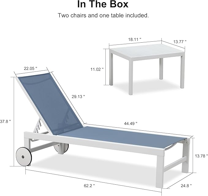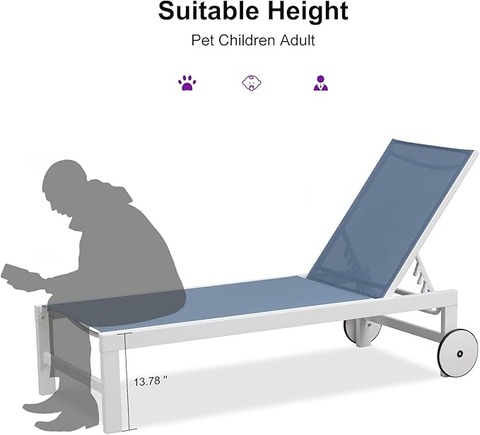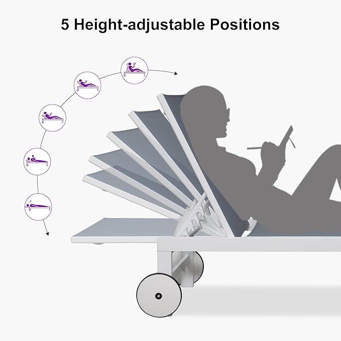 • White Aluminum Frame: The white chaise lounge offers superior sun protection; reducing heat absorption and maintaining a comfortable touch in any weather conditions; Additionally, it provides sturdy support with a maximum weight capacity of 270 pounds