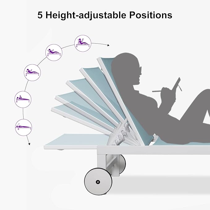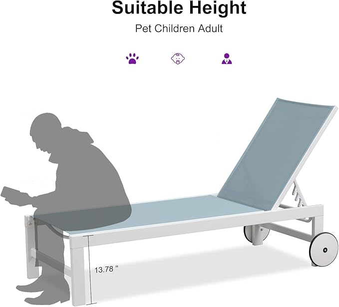 • White Aluminum Frame: The white chaise lounge offers superior sun protection; reducing heat absorption and maintaining a comfortable touch in any weather conditions; Additionally, it provides sturdy support with a maximum weight capacity of 270 pounds