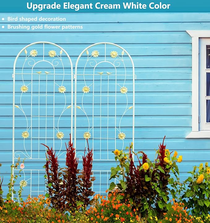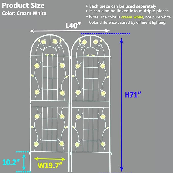 • Elegant Cream White Appearance: There are wire patterns on the garden trellises, which create the perfect surface for climbing plants or flower to grow with its delicate patterns.
