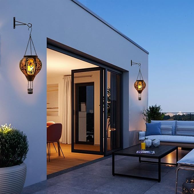 • 【Solar Powered Lantern】Hot air balloon solar lanterns hanging charging by solar energy is not only energy-saving and environmentally friendly,but also saves money. Make sure to turn on the power switch before charging. The solar lamp has a built-in light sensor that automatically lights up at night and recharges during the day.