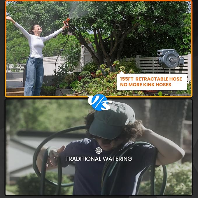 • High Grid Garden Hose: The hose reel is made to be long-lasting and leak-proof with all-weather flexible and abrasion-resistant hybrid hose. Both the 200 PSI pressure test and the 600 PSI bursting pressure test were successfully completed by the 155-foot, 1/2-inch retractable hose.
