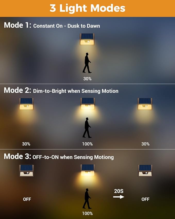 • Smart PIR Motion Inductor: vighep solar lights outdoor offer 3 lighting modes for versatile functionality. 1. Motion Sensor Mode: Lights turn on when people approach, ensuring safety and convenience. 2. Permanent On Mode: Lights stay illuminated all night for continuous visibility. 3. Smart Brightness Control: Lights stay on all night and automatically brighten when motion is detected, optimizing energy efficiency and enhancing security.