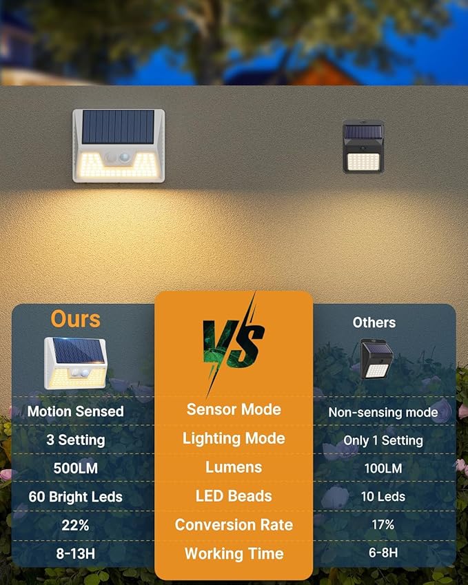 • 【Faster Charging-Longer Illumination】:This solar motion activated security light boasts a supercharged solar panel with a 20-22% conversion rate, meaning it charges up quicker during the day. That translates to longer illumination at night, keeping your outdoor space brightly lit for enhanced safety and security