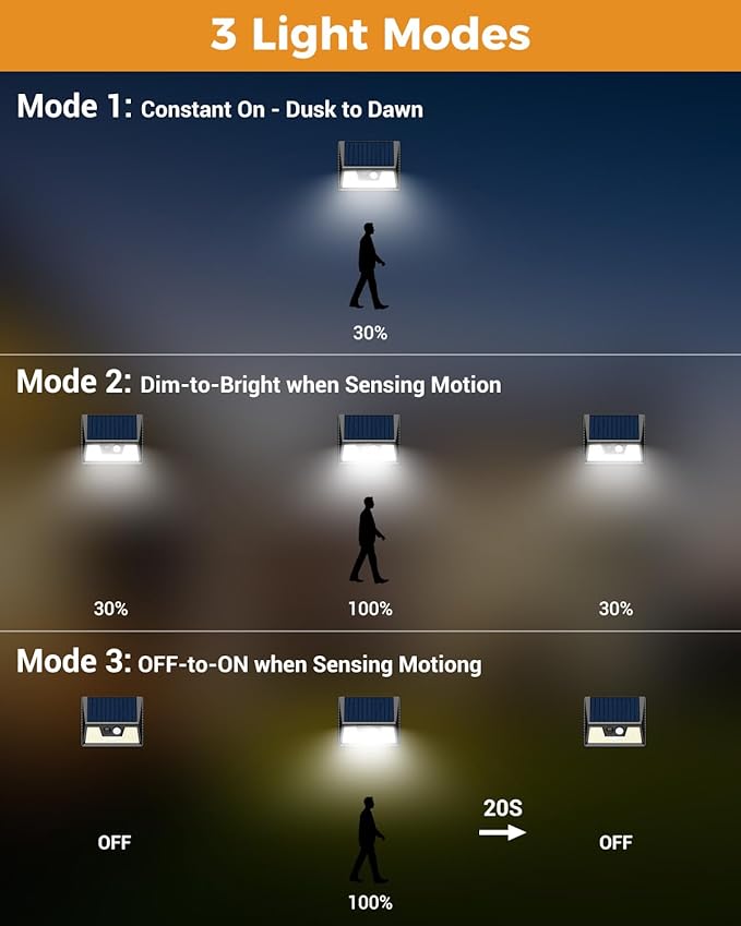 • Smart PIR Motion Inductor: vighep solar lights outdoor offer 3 lighting modes for versatile functionality. 1. Motion Sensor Mode: Lights turn on when people approach, ensuring safety and convenience. 2. Permanent On Mode: Lights stay illuminated all night for continuous visibility. 3. Smart Brightness Control: Lights stay on all night and automatically brighten when motion is detected, optimizing energy efficiency and enhancing security.