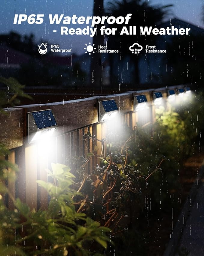• Durable IP65 Waterproof-Built to Last in Any Weather: This small but powerful fence post solar lights boasts IP65 waterproof technology, making it resistant to rain, snow, and extreme temperatures. Its durable, weatherproof, and heatproof plastic construction ensures long-lasting performance, even in harsh outdoor conditions