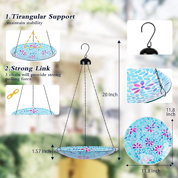 • Beautiful Mosaic Flower Bird Bath: Uses special substantial nontoxic glass, causes zero harm to birds and other creatures, and this hanging mosaic bird bath has beautiful flower pattern and distinctively bright-colored which would attract more birds to bathe